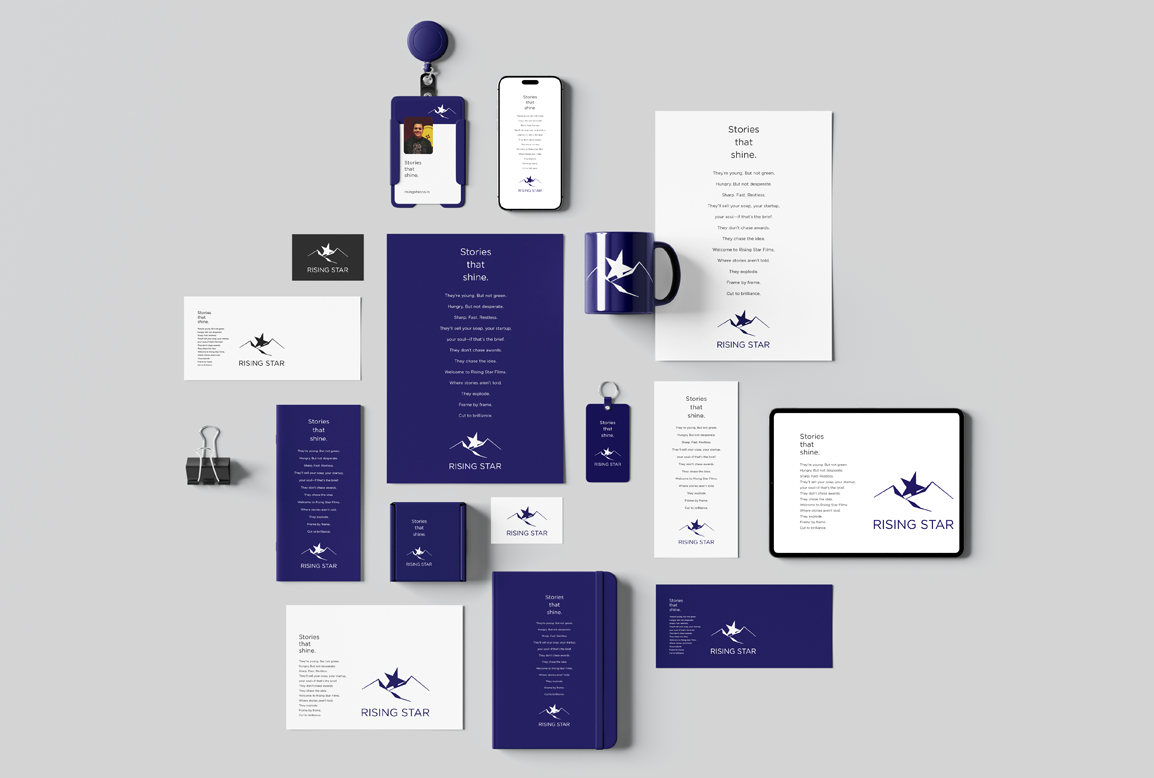 An effective logo should either show what the brand is, where it's going, or what it believes in. The identity for Rising Star Productions brings this to life with a striking emblem: a star rising from a mountaintop, symbolising ambition and ascent. Designed with clarity and intent, the mark sits within a circle—stable, contained, and memorable. The high-contrast palette of deep blue and white makes it equally impactful on both light and dark backgrounds. It’s a directional logo that reflects the brand name while also hinting at the stories of hope, growth, and brilliance it aims to tell.